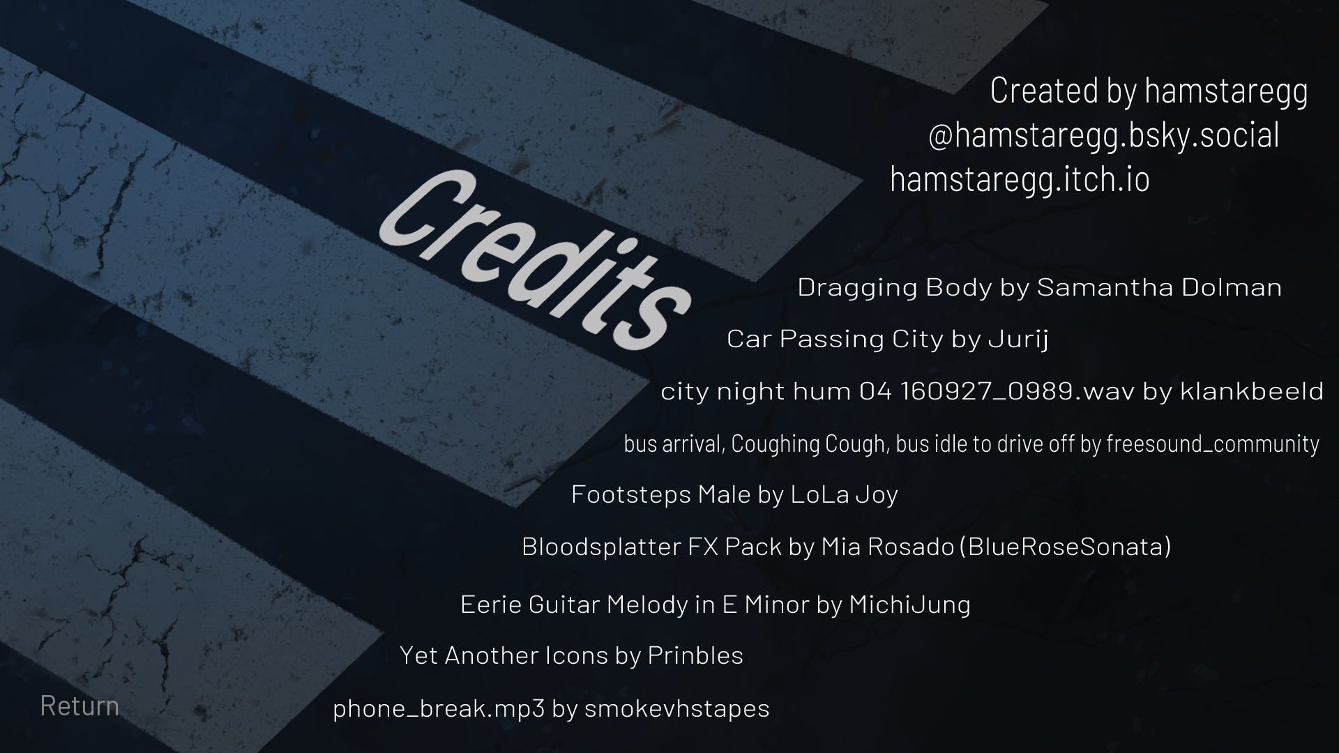 ● "Dragging Body" by Samantha Dolman ● "Car Passing City" by Jurij ● "City Night Hum" by klankbeeld ● "Bus Arrival," "Coughing Cough," & "Bus Idle to Drive Off" by freesound_community ● "Footsteps Male" by LoLa Joy ● "Eerie Guitar Melody in E Minor" by MichiJung ● "Phone Break" by smokevhstapes
